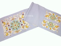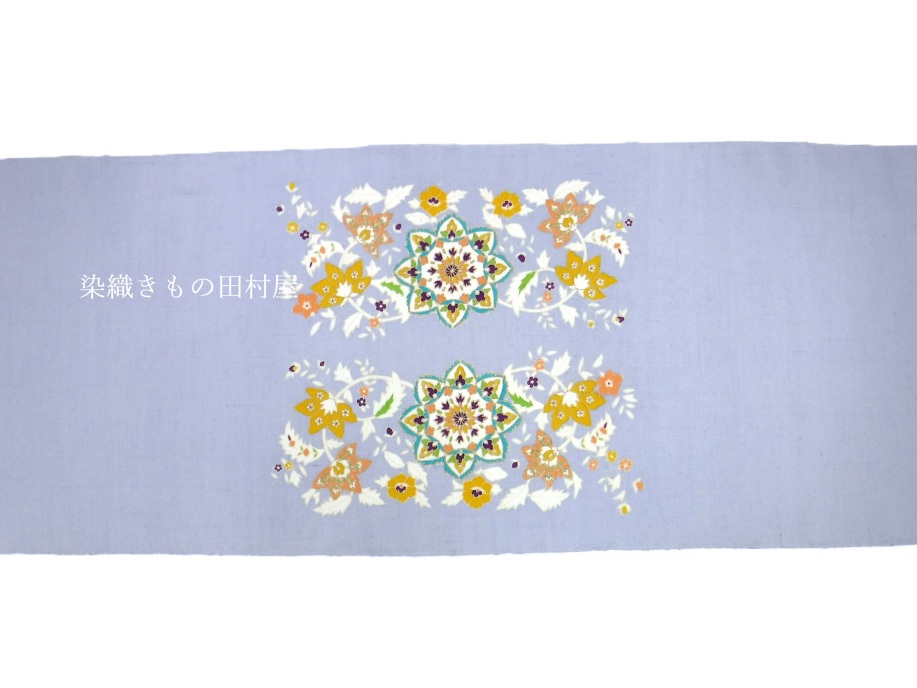 岡重の染め帯に似ておりますが、本品は手作業にて糊置きした手描きの京友禅となります。 型による染めは煩雑な柄でも量産するには向いておりますが、染めの質感が均一になってしまうという弱点もございます。 手描き友禅は、基本どんな柄も製作可能ですが、手作業故に効率とコストがかさむという難点があります。 こちらの染屋さんは京都でも珍しい、 悉皆(現場)&問屋という中間的な立ち位置で問屋を省く事によりコストを下げる事が可能です。 手描き = 彩色 で手による糸目も大切ですが、彩色に筆が入るという事で、 色彩のボリューム感というか、立体感が型染めとは異なって参ります。 使用している紬地は真綿系のような毛羽立ちはなく、かと言って生紬ほどシャリ感はなく、 サラリとした手触りの紬地です。 地色は浅紫より青く、半色より明るく、ラベンダーかクロッカス色くらいの鮮やかさです。 写真では 反物 が一番実物に近いかと思います。 帯の地色としては変わり色ではありますが、白地・黒地の帯あは既にお持ちの方。 暗くなりがちな織物系の着物を明るく爽やかにコーディネートしたい方にはお薦めです。 こちらの生地でしたら、透けない単衣の時期前半まで大丈夫かと思います。 |