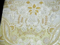 西陣織のジャガードで織られた最高級の袋帯です。 ジャガード織では最高級の部類かと思います。 紋紙を用いた織物ですが、その文紙からして凝っています。 通常繰り返し柄が続き、お太鼓と帯前は同じ柄となりますが、 本品は帯前用に違う柄を用意しています。 途中で紋紙を変える必要があり、2倍の手間とコストが掛っている事になります。 帯前の柄は左右で違うように配置され、またしっかりと横を向いた柄となっておりますので 締めた際の決まり具合が違いますね! ジャガード織ではどうしても柄が多いと裏地に走るヨコ糸が多くなり、 帯が重く、厚くなるのですが、こちらは軽くする為に夏物のような透けるほどの薄い地織としています。 単衣向きに織った訳ではなく、あくまで軽くする為に試行錯誤した結果ですが、 袷・単衣どちらでもご着用になれるような素材感となっています。 ベースは白とライムイエローの横段で、柄を黄色、銀糸・金糸・オレンジ系のベージュの濃淡で構成されています。 豪華な柄ですが色使いが軽やかで、現代的な印象の袋帯です。 |