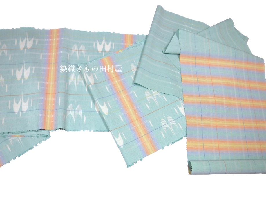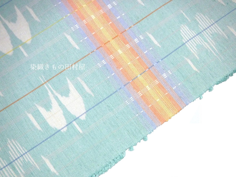 沖縄県生まれの若手の染織作家さんです。 現在は沖縄県の芸術大学で非常勤講師をされながら創作活動をされています。 本品は、手結い絣とロートン織を併用した紬織帯地となります。 沖縄の青い空に鳥たちが羽ばたく様子を思い織り上げたひと品です。 色鮮やかな横段は空に掛かる虹のようにも見えます。 個人作家さんで絵絣を織る事は大変な労力を伴います。 無地糸を使用した、縞、横段、格子が作家作品に多い事を考えて頂くとお判りいただけるかと思います。 産地織物は分業で各工程別れての作業が見られますが、個人作家さんは糸作りから始めますので 括りの工程が必要な絵絣のお品はぐーっと数が少ないです。 糸を括りながら、こういう出来上がりにしたいな・・・と想い大幅な作業時間を割いた絣の作品は 作家さんの気持ちが詰まったお品と感じます。 ダークであったり、モノトーンに成りがちな織物コーデを明るくしてくれる手織り帯です。 お手持ちのお気に入りの着物に是非合わせてお楽しみいただきたいです。 < 大濱真子 略歴 > 1995 沖縄県に生まれる 2017 京都造形芸術大学 染織テキスタイルコース 卒業(現京都芸術大学) 2018,10 第73回 新匠工芸会展 入選 東京都美術館 京都市美術館別館 2018.11 第38回 友労染展「染住民の祭り」 色彩賞 京都市勧業館 みやこめっせ 2019.10 第39回 友労染展「染住民の祭り」 市長賞 京都市勧業館 みやこめっせ 2019第74回 新匠工芸会展 入選 東京都美術館 京都市美術館別館 2019 沖縄県立芸術大学院 修了 2020.11 第40回 友労染展「染住民の祭り」 色彩賞 京都市勧業館 みやこめっせ 2021.10 第75回 新匠工芸会展 入選 東京都美術館 京都市美術館別館 2022.6 第56回 西部伝統工芸 入選 福岡三越 鶴屋百貨店、熊本 2025,5 西部伝統工芸展 最高賞・朝日新聞社大賞 受賞 現 在 沖縄県立芸術大学 非常勤講師