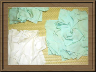 上の写真は白生地を横巾半分に裁断した物。 上が経年により黄変した元の状態。下が晒して白くなった状態。 その他、生地の状態により 下洗い・色抜きなどの加工をしてから染色します。 今回の品物は色抜きしました。 |