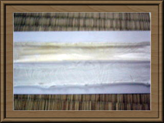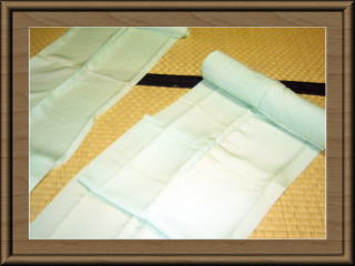 今回は染替える八掛・表地を羽縫いしました。袖・身頃・衿・・・・・ と縫い合わせると反物の状態に戻ります。 手前 表地 ・ 奥 八掛 |