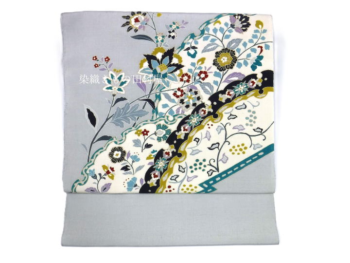 紬地 染め九寸名古屋帯 「 更紗に雪輪重ね 」 |