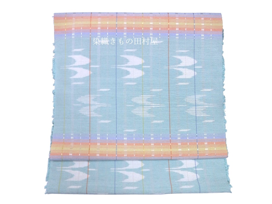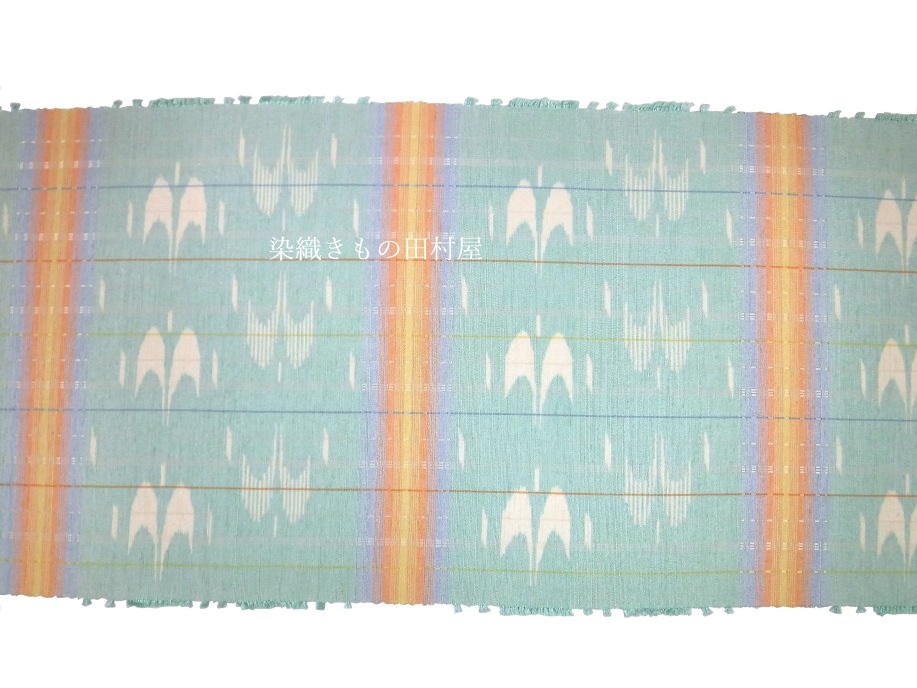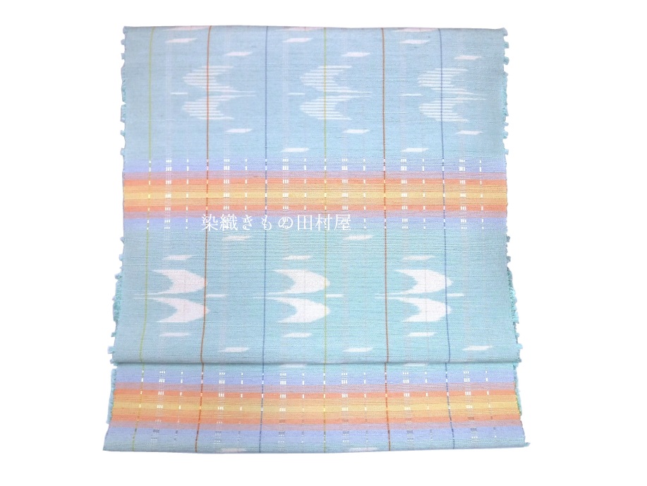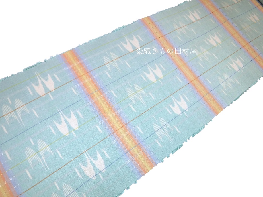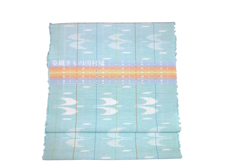 沖縄県生まれの若手の染織作家さんです。 現在は沖縄県の芸術大学で非常勤講師をされながら創作活動をされています。 本品は、手結い絣とロートン織を併用した紬織帯地となります。 沖縄の青い空に鳥たちが羽ばたく様子を思い織り上げたひと品です。 色鮮やかな横段は空に掛かる虹のようにも見えます。 個人作家さんで絵絣を織る事は大変な労力を伴います。 無地糸を使用した、縞、横段、格子が作家作品に多い事を考えて頂くとお判りいただけるかと思います。 産地織物は分業で各工程別れての作業が見られますが、個人作家さんは糸作りから始めますので 括りの工程が必要な絵絣のお品はぐーっと数が少ないです。 糸を括りながら、こういう出来上がりにしたいな・・・と想い大幅な作業時間を割いた絣の作品は 作家さんの気持ちが詰まったお品と感じます。 ダークであったり、モノトーンに成りがちな織物コーデを明るくしてくれる手織り帯です。 お手持ちのお気に入りの着物に是非合わせてお楽しみいただきたいです。 < 大濱真子 略歴 > 1995 沖縄県に生まれる 2017 京都造形芸術大学 染織テキスタイルコース 卒業(現京都芸術大学) 2018,10 第73回 新匠工芸会展 入選 東京都美術館 京都市美術館別館 2018.11 第38回 友労染展「染住民の祭り」 色彩賞 京都市勧業館 みやこめっせ 2019.10 第39回 友労染展「染住民の祭り」 市長賞 京都市勧業館 みやこめっせ 2019第74回 新匠工芸会展 入選 東京都美術館 京都市美術館別館 2019 沖縄県立芸術大学院 修了 2020.11 第40回 友労染展「染住民の祭り」 色彩賞 京都市勧業館 みやこめっせ 2021.10 第75回 新匠工芸会展 入選 東京都美術館 京都市美術館別館 2022.6 第56回 西部伝統工芸 入選 福岡三越 鶴屋百貨店、熊本 2025,5 西部伝統工芸展 最高賞・朝日新聞社大賞 受賞 現 在 沖縄県立芸術大学 非常勤講師