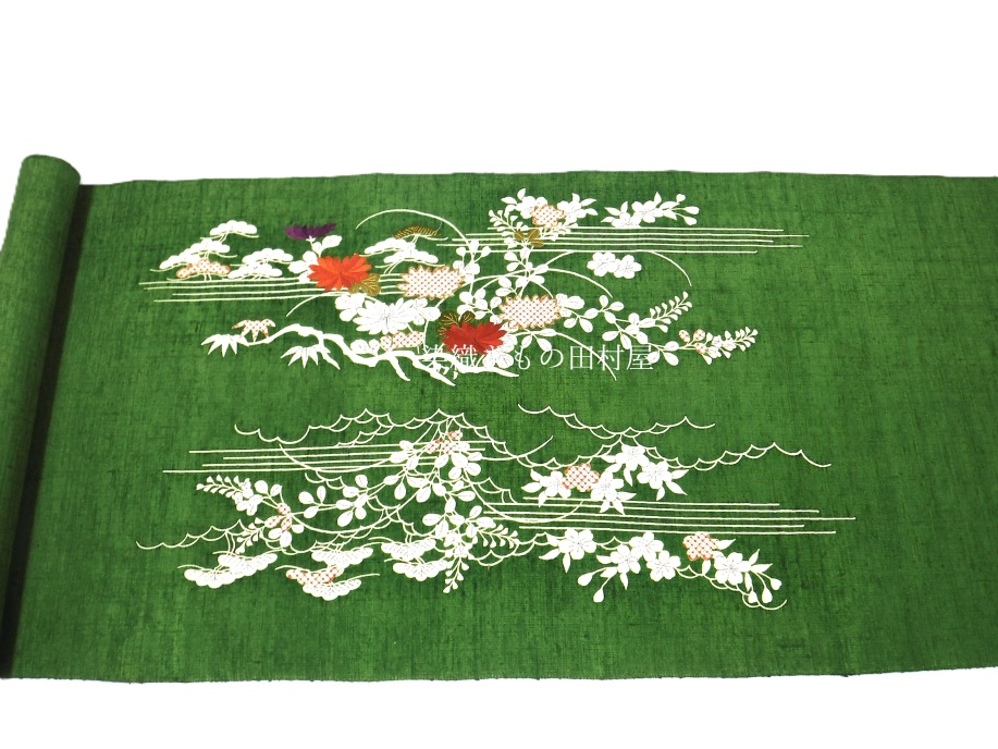 京都の刺繍を専門とした染匠によるお品です。 普段は多くの老舗、染の逸品問屋・メーカーの下職として製作活動をしています。 そして手の空いた時にお抱えの職人さん達へ自前の商品を作らせます。 様々な注文を日頃捌いていますので情報の蓄積が凄く、製作の引き出しの巾が多いのです。 趣味っぽいお品、雅なお品、粋なお品・・・ 異なる染屋・メーカーなどの仕事を熟していますので、一辺倒にならないのです。 本品は紬地を鮮やかな濃い緑に染めた地に、糸目の御所解きと刺繍のお品です。 濃い色に染めると、紬の糸の太い細いが染め上がりにはっきりと出てきます。 横方向に顕著に出ますが、糸の太い細いが色の濃い薄いとなり、擦れたような表情となります。 松の葉のような渋くもはっきりとした緑が対照的な華やかな刺繍とお互いに引き立てています。 そして毎度思うのですが、帯前柄がたっぷりなのです。 他の染屋さんですと6寸とかですが、1尺5寸以上の帯前柄が付いております。 これが着用された際にとても美しい着姿となります。 お太鼓も上下たっぷりと柄があり、着付けでずらす事により後ろ姿の印象もかわります。 前後ろの柄の分量は附下並みに描かれております。 江戸小紋や織物の着物などに最高な一本です。 |