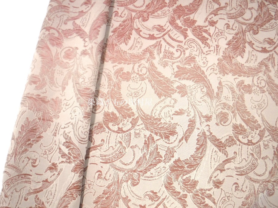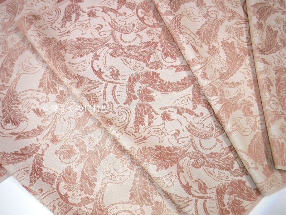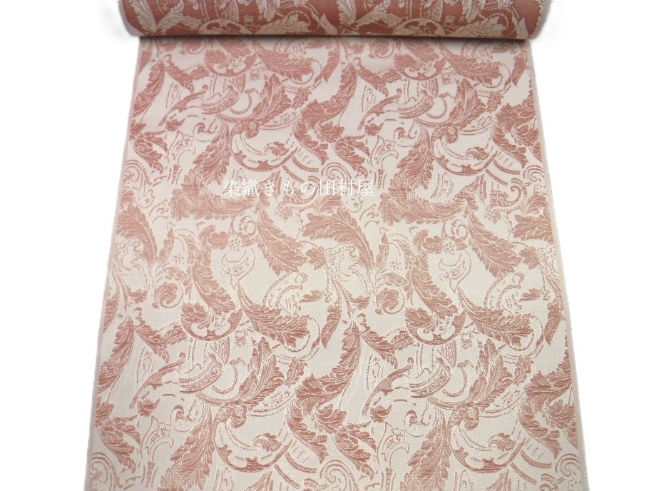 先染(糸の段階で色が付いている)の西陣織のお召しです。 地糸がベージュ糸なのに対して、柄糸部分のみ赤茶糸で織り上げています。 写真ですと赤が際立ちますが、現物は地色と織り混ざるので糸の持つ色の半分くらいの色合いとなります。 帯次第で、普段きものからよそいききものまで、 また生地巾も広いですので羽織もの・コートとしても裄の長い方へも対応出来ます。 生地に張りがありますので、裏地を付けない単衣コートなども良いかもしれませんね。 染物である白生地に対して織物のお召は風合いも異なりますので、そこもお楽しみのひとつです。 |