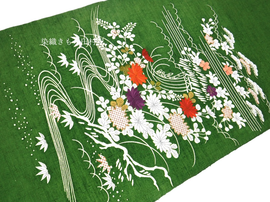 京都の刺繍を専門とした染匠によるお品です。 普段は多くの老舗、染の逸品問屋・メーカーの下職として製作活動をしています。 そして手の空いた時にお抱えの職人さん達へ自前の商品を作らせます。 様々な注文を日頃捌いていますので情報の蓄積が凄く、製作の引き出しの巾が多いのです。 趣味っぽいお品、雅なお品、粋なお品・・・ 異なる染屋・メーカーなどの仕事を熟していますので、一辺倒にならないのです。 本品は紬地を鮮やかな濃い緑に染めた地に、糸目の御所解きと刺繍のお品です。 濃い色に染めると、紬の糸の太い細いが染め上がりにはっきりと出てきます。 横方向に顕著に出ますが、糸の太い細いが色の濃い薄いとなり、擦れたような表情となります。 松の葉のような渋くもはっきりとした緑が対照的な華やかな刺繍とお互いに引き立てています。 そして毎度思うのですが、帯前柄がたっぷりなのです。 他の染屋さんですと6寸とかですが、1尺5寸以上の帯前柄が付いております。 これが着用された際にとても美しい着姿となります。 お太鼓も上下たっぷりと柄があり、着付けでずらす事により後ろ姿の印象もかわります。 前後ろの柄の分量は附下並みに描かれております。 江戸小紋や織物の着物などに最高な一本です。 |